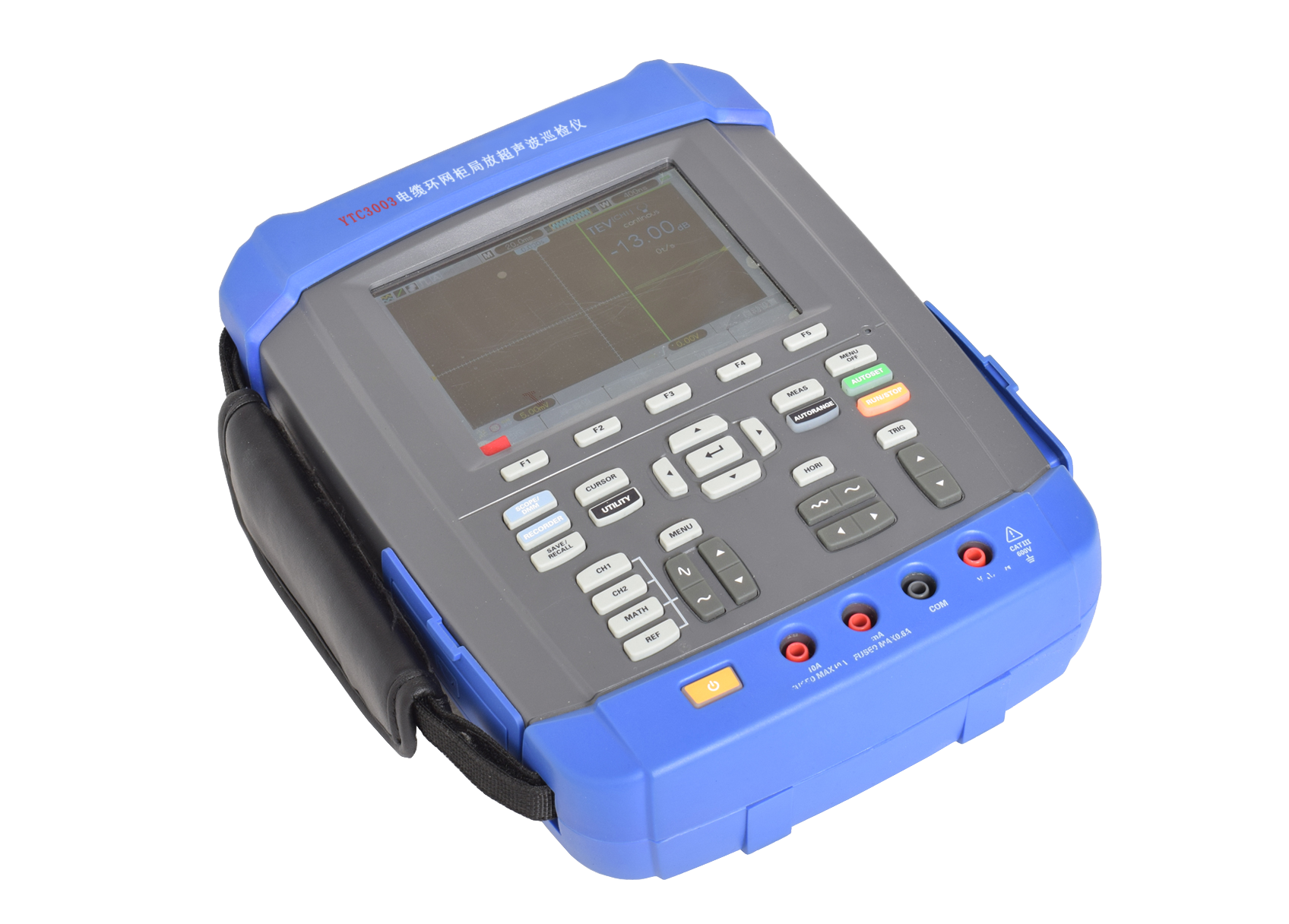 1.使用手持式局放測試儀進行檢測時,使用一種傳感器進行檢測時,選擇通道 1 進行檢測,若需使用兩種傳感器檢測時,再使用通道 2 檢測。注意:檢測過程中若需更換傳感器檢測,需將“輸出電壓”關閉。 2.開關柜外部的一些源發出的電磁信號也可能在開關柜的外部產生瞬時接地電壓,這些源可以是架空線絕緣子、變壓器進行套管、強的無線電信號甚至是附近高速公路的車流量。這些也可以在不連接到開關柜的金屬體如變電站房門或圍欄等金屬體上產生瞬時接地電壓信號。因此在對開關柜進行檢測之前,就應該測量出這些表面上的背景噪聲。 3.主機開啟后,確保 TEV 傳感器處在離開金屬體的自由空間中,否則會影響自檢。選擇 TEV 模式。為了進行測量,應該使 TEV 傳感器垂平行與在其上面要進行測量的金屬體接觸。如果儀器處在連續測量模式,則應該立即顯示讀數,但是一旦 TEV 傳感器從金屬體上拆下后讀數就不再在顯示屏上繼續顯示。如果是在單次測量模式,則一旦按下按鈕,在這種模式下,讀數會保留顯示在顯示屏上。如需要確保一致性,可以重復測量幾次。