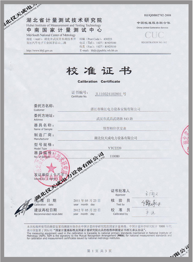 轉(zhuǎn)載:"YTC2220數(shù)字雙鉗相位伏安表鑒定證書" 請注明來源于儀天成電力。 更多技術(shù)問題請致電儀天成電力客戶服務:027-87876585,技術(shù)部專線:027-87876585,在線客服:719388481